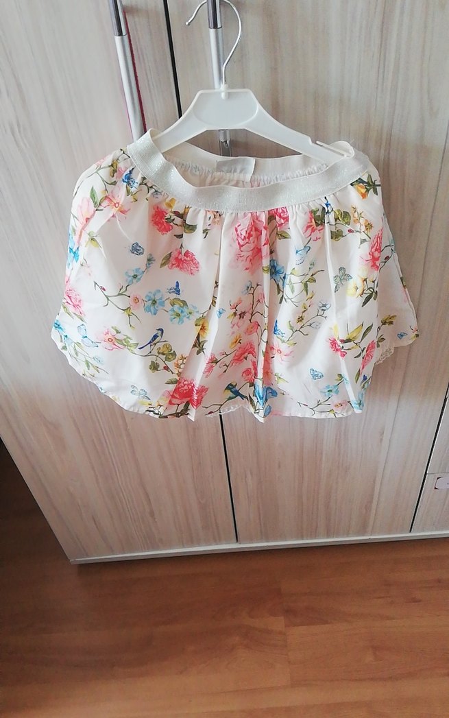 Yumuşak sentetik kumaştan, pastel çiçek desenli, bol kesim ve fırfırlı kız eteği, bohem tarz için uygundur.