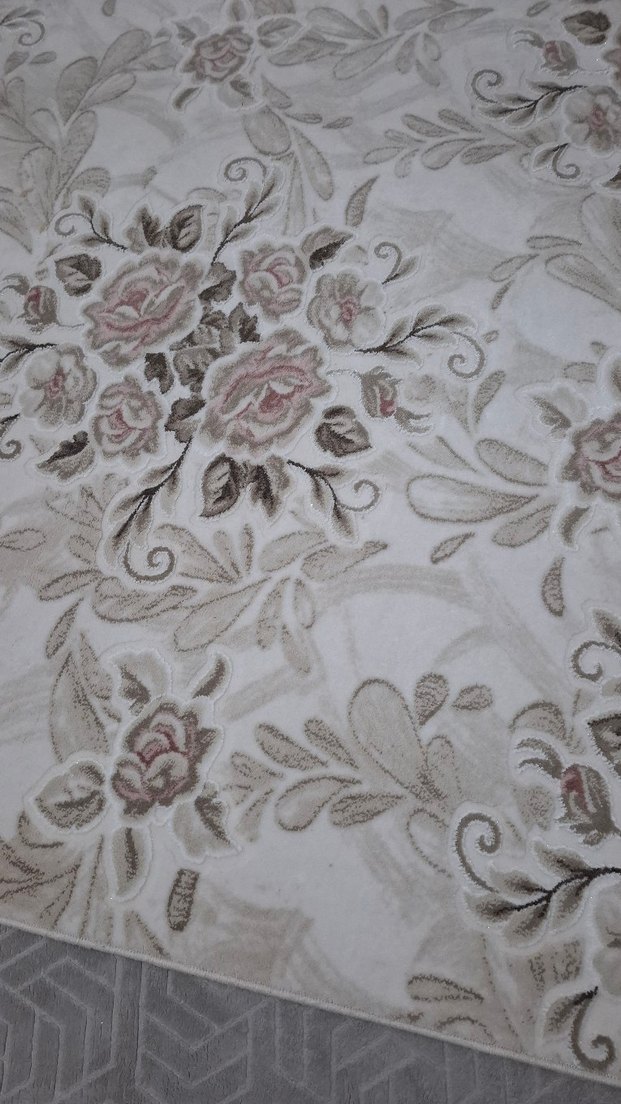 Beyaz ve gri tonlarda çiçek desenli, klasik tarzda yumuşak dokulu bir halı. 4m2 kalın halı.