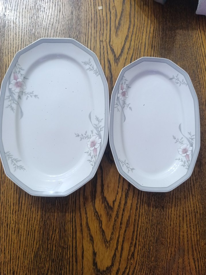 Çiçek desenli beyaz ve gri servis tabakları, pürüzsüz dayanıklı malzemeden yapılmış. İki farklı boyutta, yemek servisi için uygun. ️olculeri 33*22 Küçük 28*18 cm'dir