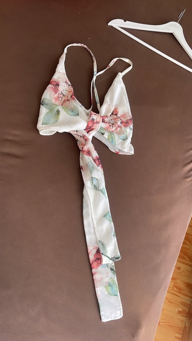 İpek dokusuyla beyaz, pastel çiçek desenli bohem tarzda fular, fiyonk detayıyla retro ve hippie görünüme uygundur.