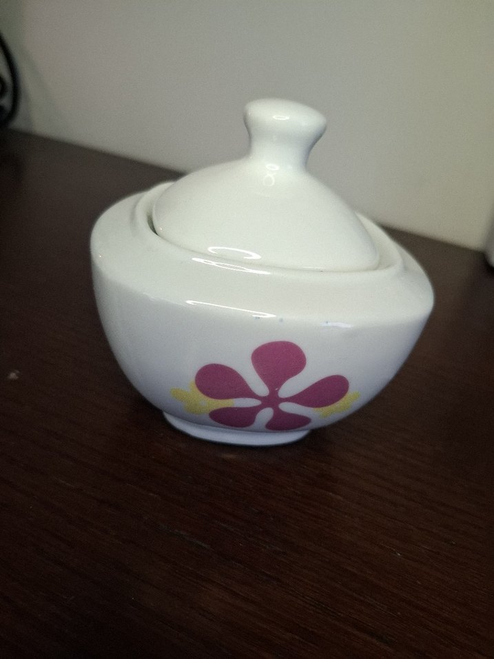 Pembe çiçek desenli, kapaklı beyaz seramik şekerlik.