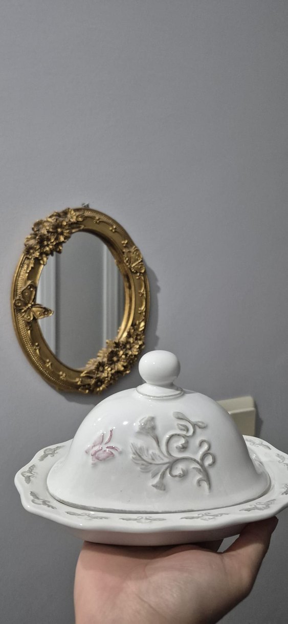Beyaz, çiçek desenli ve kapaklı geleneksel tarzda tabak. ️