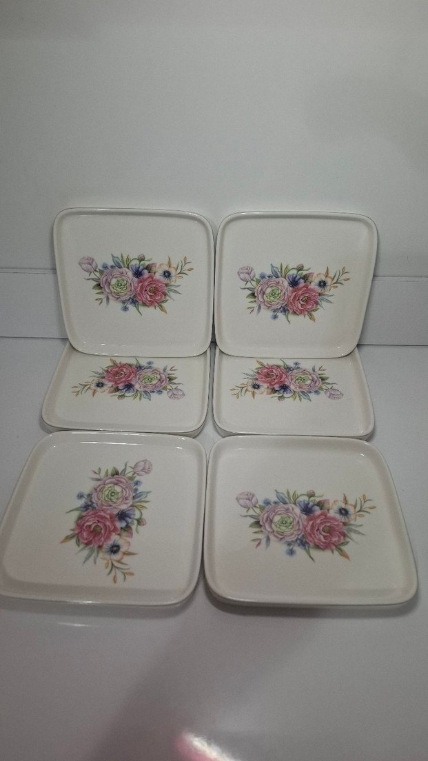 Altı adet beyaz kare tabak, üzerinde zarif çiçek desenleriyle servis için uygundur.
