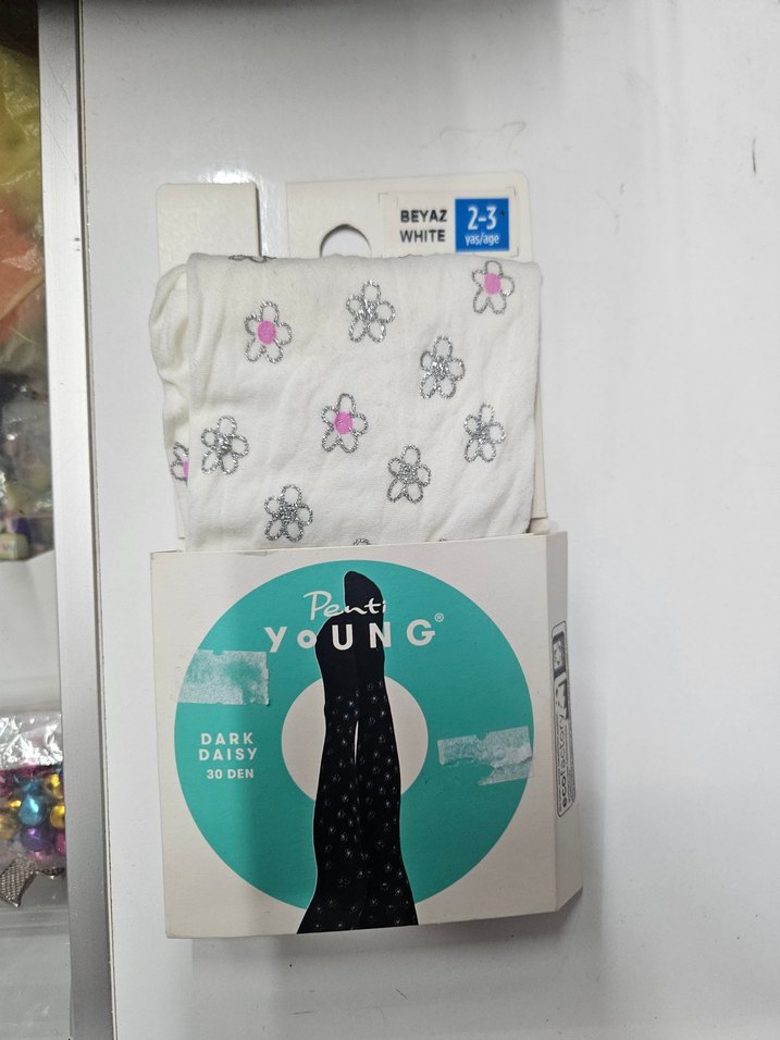 2-3 yaş için beyaz, pembe ve gri çiçek desenli kız çocuk külotlu çorap.