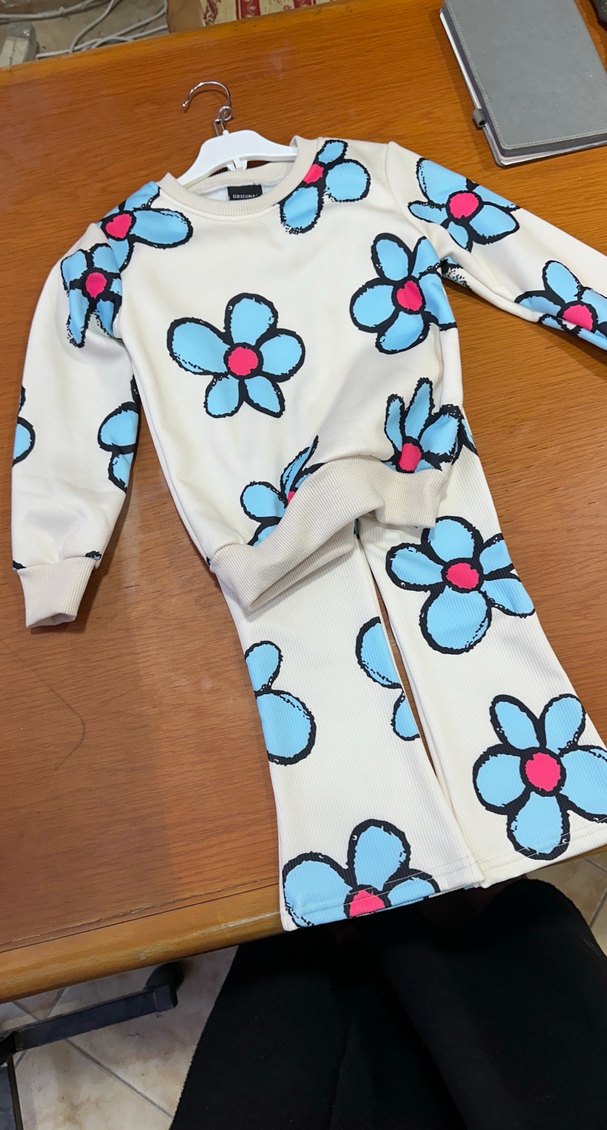 Pastel mavi ve pembe çiçek desenli beyaz kız eşofman takımı, bol kesim, uzun kollu, yuvarlak yaka, düğme detaylı, yumuşak sentetik kumaş.