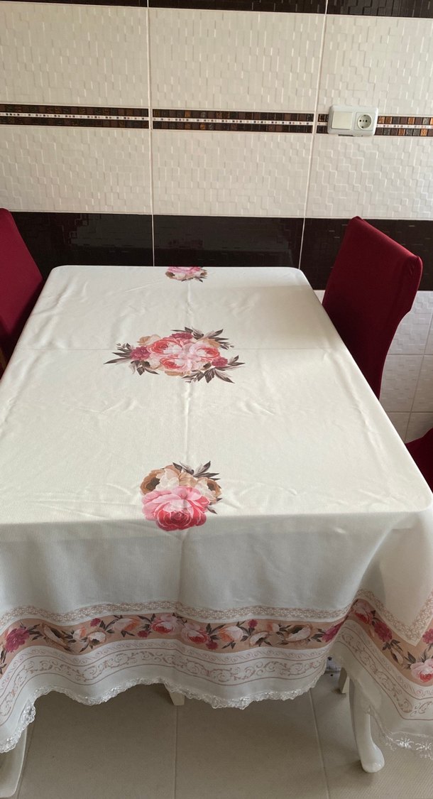Yumuşak pembe ve kırmızı çiçek desenli baskılı beyaz masa örtüsü, yemek alanınıza zarif bir dokunuş katar.