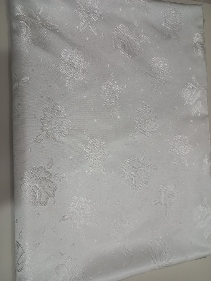 Gri tonlarda çiçek desenli, klasik tarzda beyaz masa örtüsü, zarif dokusuyla dikkat çekiyor.