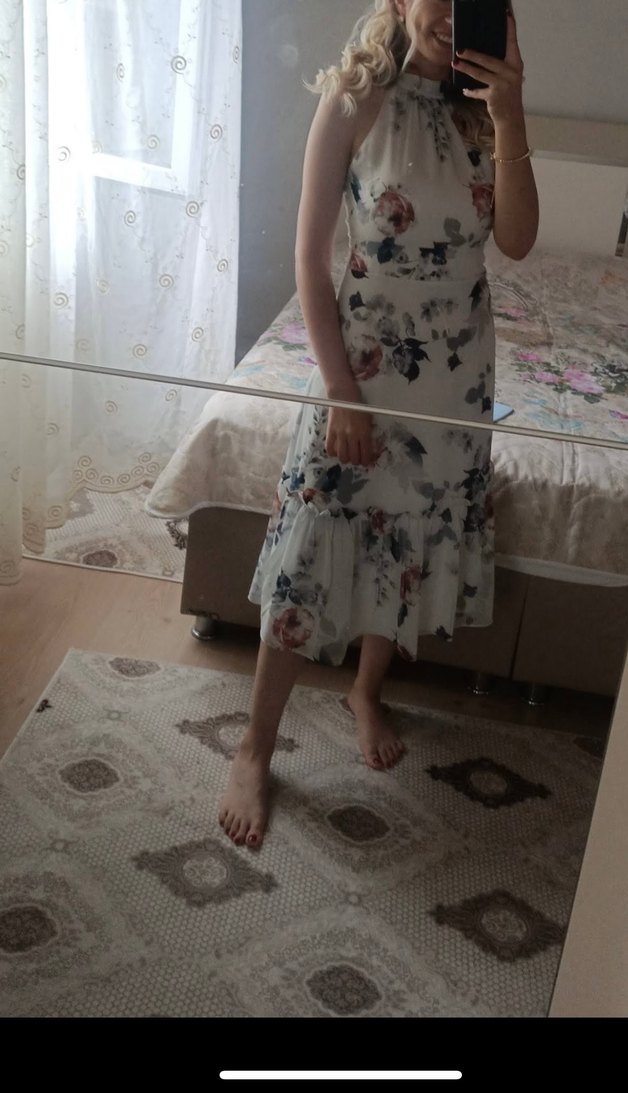 Çiçek desenli, straplez yaka ve fırfırlı detaylara sahip beyaz midi elbise. Bohem tarzda, yumuşak sentetik kumaştan üretilmiştir. 2 kez giyildi kusursuzdur