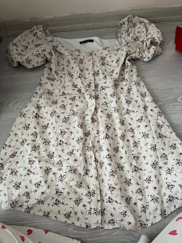 Yumuşak keten kumaştan yapılmış, düğmeli, straplez yakalı, kısa balon kollu, gevşek kesimli beyaz midi elbise. Pastel çiçek desenlidir, bohem tarzına uygundur.