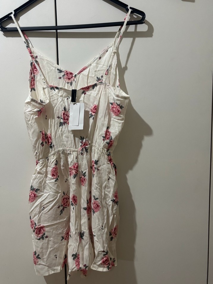 Çiçek desenli, V yakalı, salaş kesim beyaz askılı tulum. Fırfır detaylarıyla günlük sokak stili için uygundur.