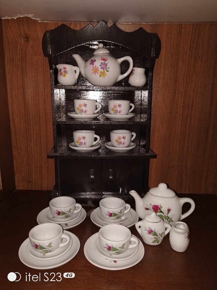 Çiçek desenli beyaz mini çay takımı; demlik, fincanlar, tabaklar ve sütlük içerir. Küçük sunumlar veya vitrin için uygundur. ☕çin damgalı 1500 TL diğeri 1000 TL vitrin ayrıca 1000 tl