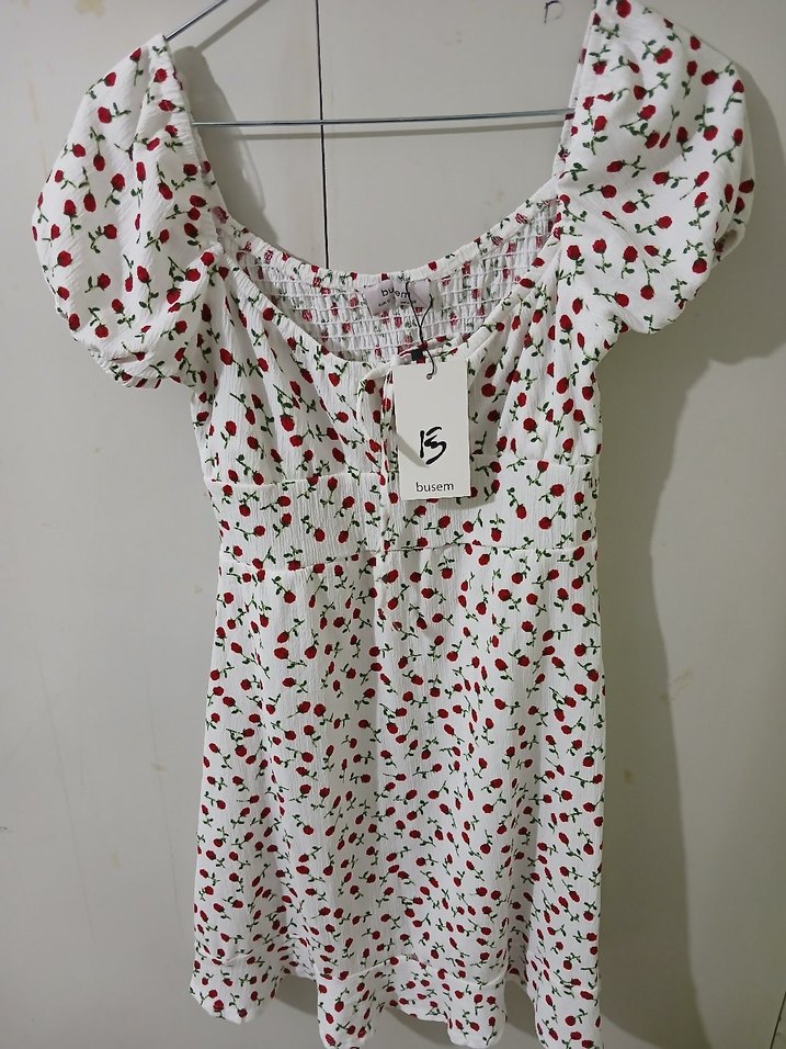 Kısa kollu, V yaka ve düğmeli beyaz midi elbise. Çiçek desenli, bol kesim, rahat sokak tarzı için uygun.