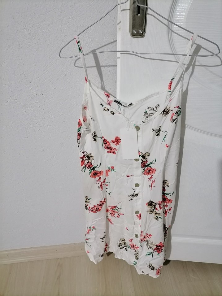Çiçek desenli, düğmeli, V yaka, askılı, bol kesim beyaz mini elbise. Hafif sentetik kumaştan, bohem tarzda sokak giyimine uygun.