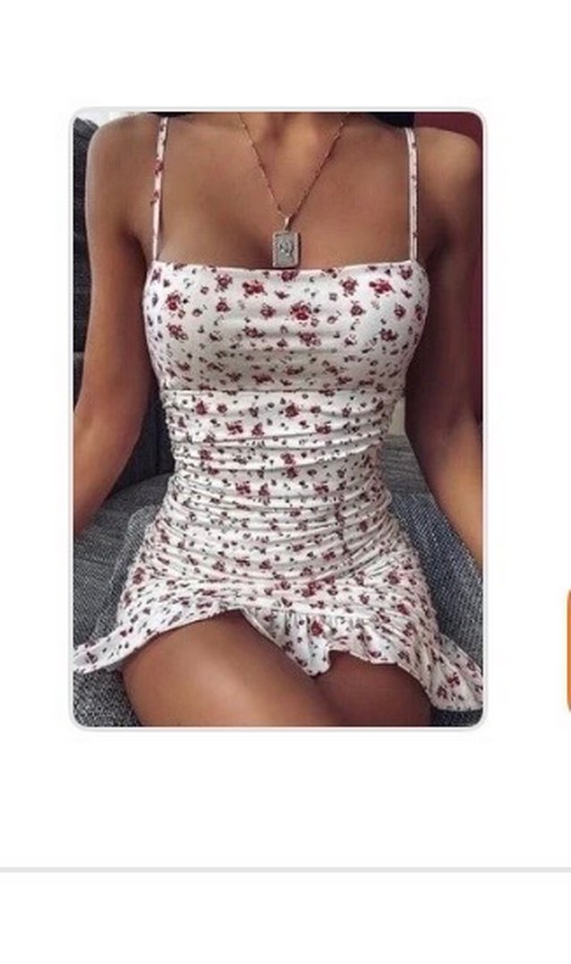 İnce askılı, V yakalı ve çiçek desenli beyaz mini elbise, sentetik kumaştan ve dantel detaylıdır. Cesur, bohem sokak stili için uygundur.