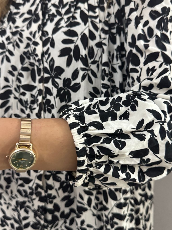 Siyah çiçek desenli, uzun kollu, V yakalı, düğmeli beyaz mini elbise. Yumuşak pamuk kumaştan, rahat kesim.