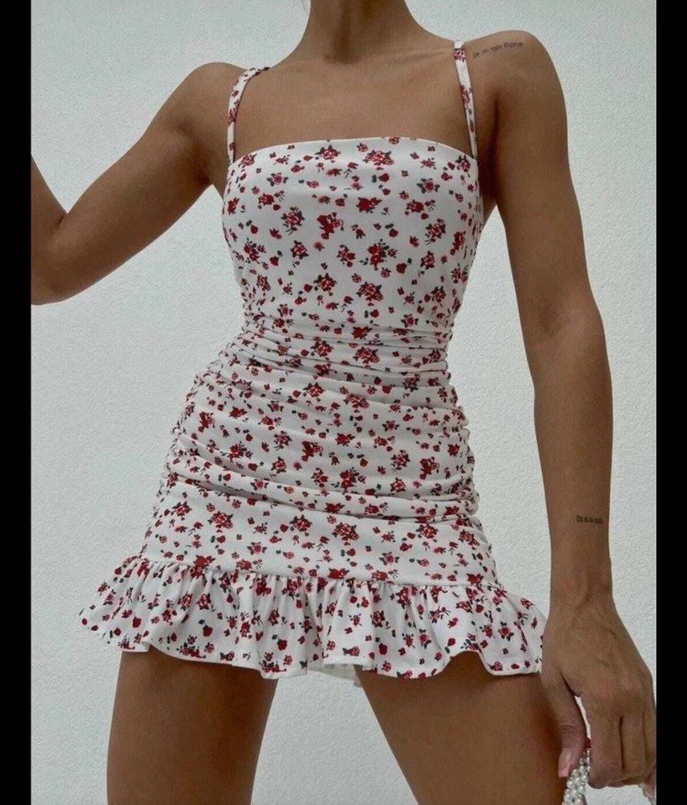 Beyaz renkli, çiçek desenli mini elbise, vücuda oturan kesimi ve fırfırlı detaylarıyla dikkat çeker. Askılı ve straplez yakaya sahip, yumuşak sentetik kumaştan üretilmiştir.