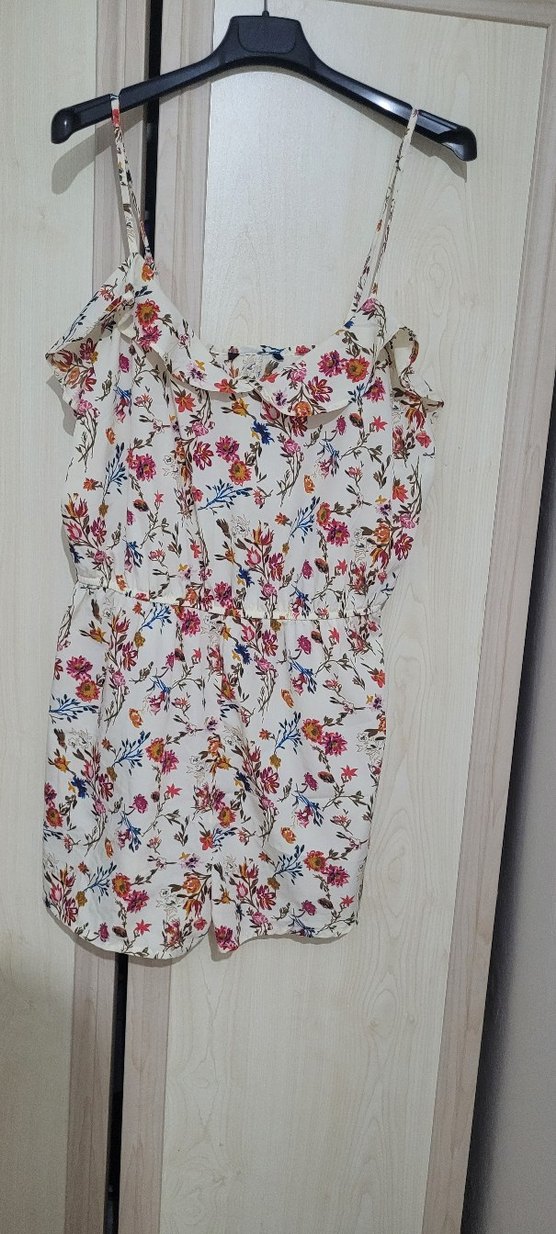 Beyaz mini tulum, straplez yaka ve fırfır detaylıdır. Çiçek desenli, hafif sentetik kumaştan, bol kesim ve bohem tarzda. incecik bir kumaşı var.