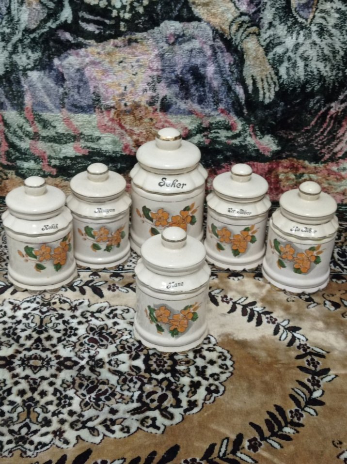 Kapaklı, çiçek desenli beyaz seramik mutfak baharatlık seti, çeşitli baharatlar için etiketli.