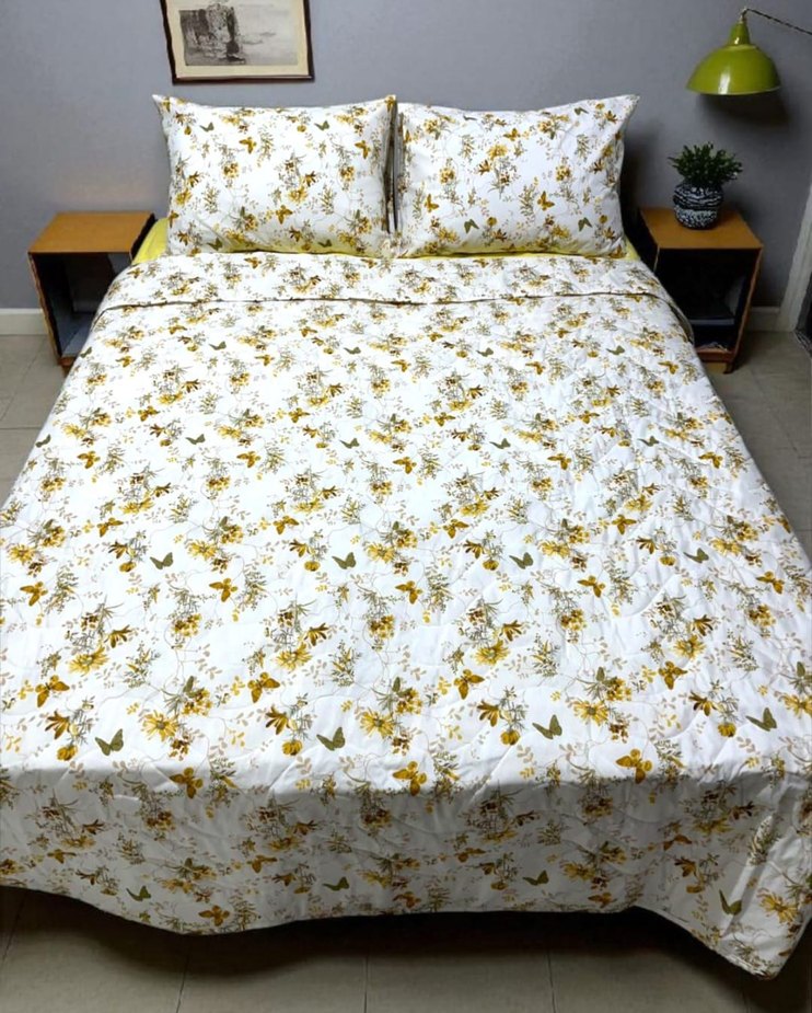 Çiçek desenli, beyaz nevresim ve çarşaf takımı, yatak odasına canlılık katan renkli detaylara sahip .
