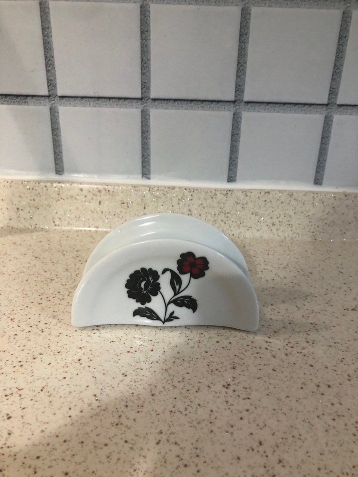Klasik tarzda, koyu renkli çiçek desenli beyaz peçetelik.