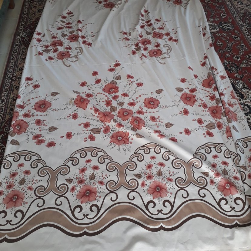 Pembe ve kahverengi çiçekler ile süslenmiş beyaz perde, klasik tarzda ve dekoratif bordürlere sahip eni 2.85cm boyu 2.30cm hiç kusuru yoktur tek parcadir.