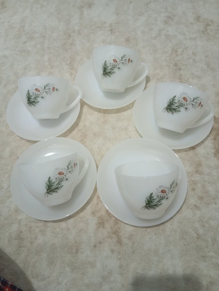 Beşli beyaz porselen fincan ve tabak seti, üzerinde zarif çiçek deseni bulunur. Çay veya kahve servisi için uygundur. arcopal ürün 5 adet alti ve 5 fincandan oluşuyor.☕