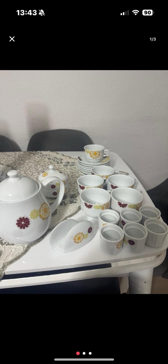 Beyaz porselenden yapılmış, renkli çiçek desenlerine sahip çay seti; demlik, fincan, tabak ve yumurta tutucular içerir.