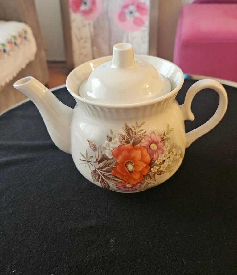 Çiçek desenli beyaz porselen demlik, kıvrımlı ağız ve kulp ile. Hafif ve zarif tasarımda çay servis için. ☕