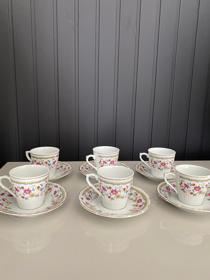 Pastel renkli çiçek desenleri ve altın detaylara sahip beyaz porselen fincan ve tabak seti.Sadece belirsiz renk deformesi var kırık yoktur markasız ürün iade yok #beyaz#porselen#çiçek#altın#porselen#ucuz#kahve#sunum