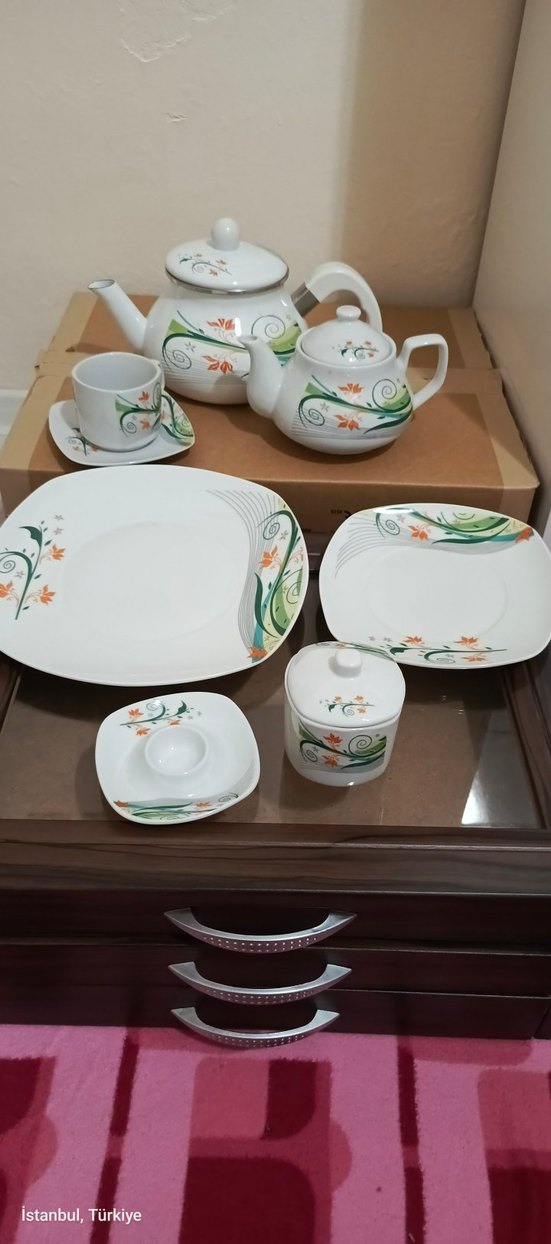 Çiçek desenli, yeşil ve turuncu detaylı beyaz porselen sofra takımı; çaydanlık, tabak, fincan yumurtalık içerir