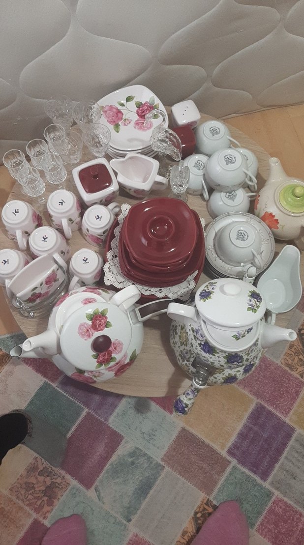 Çiçek desenli beyaz porselen kahvaltı takımı, fincanlar, tabaklar, çaydanlık ve bardaklarla birlikte servis için uygundur hiç kullanılmamış ürünler ek parçalarda var hepsi birlikte satılık yer kurtköy
