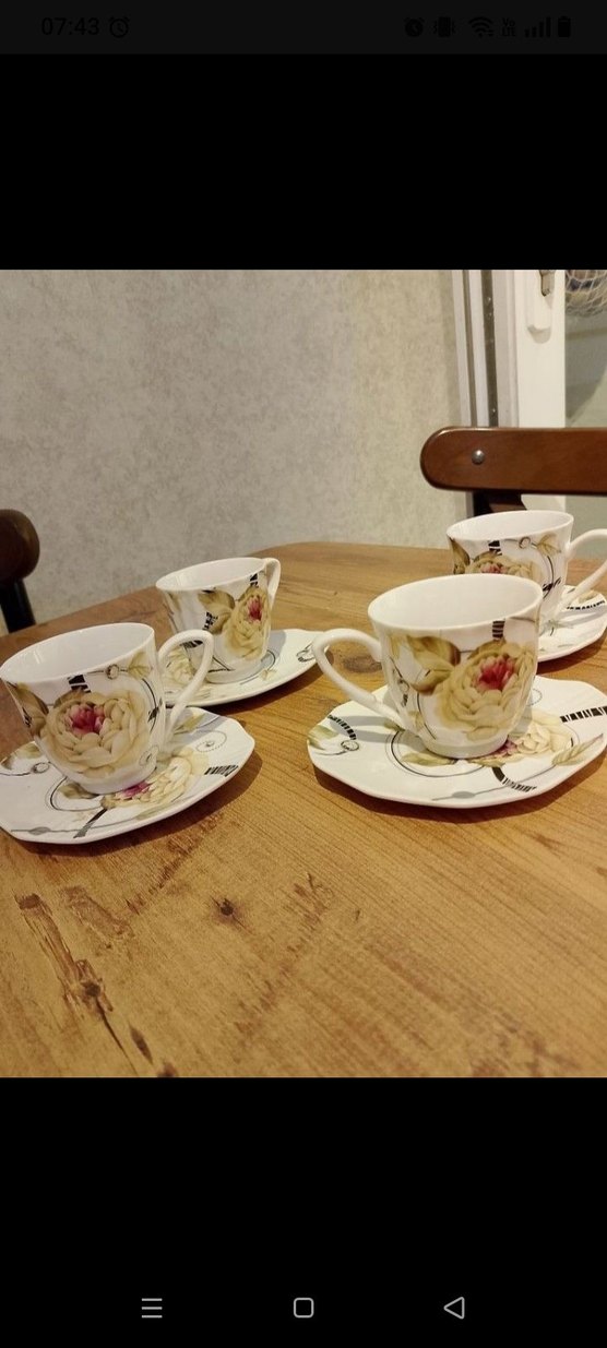 Çiçek desenli beyaz porselen fincan takımı, kahve servisi için uygundur. Her fincanın yanında uyumlu bir tabak bulunur. ☕