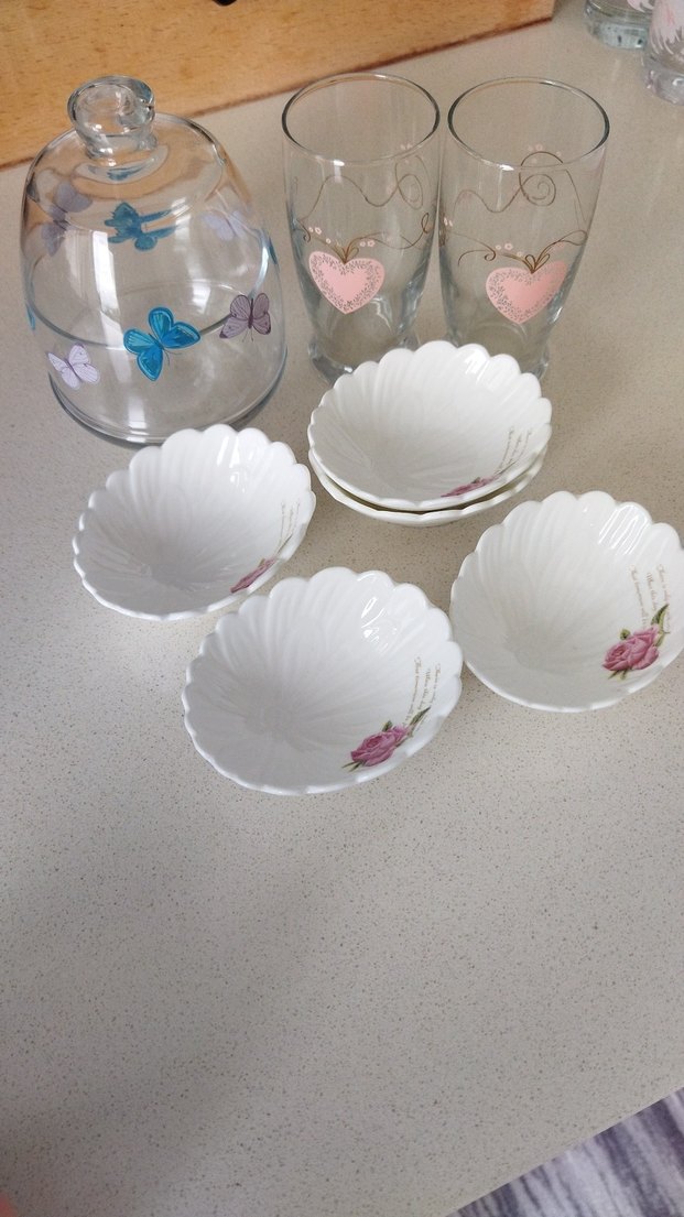 Çiçek desenli, beyaz porselenden yapılmış, dalgalı kenarlı kaselerden oluşan set. Yanında kelebek desenli cam örtü ve kalpli bardaklar bulunur. ️