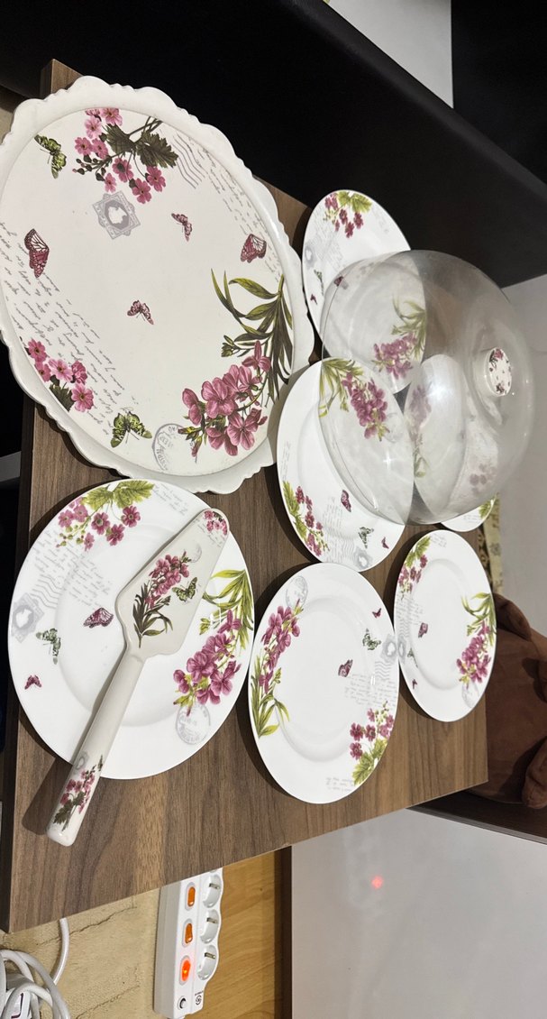 Çiçek desenli beyaz porselen tabaklar, servis tepsisi ve cam kapaklı set. Toplam 9parça Şık tatlı sunumu için uygundur. İhtiyaç fazlası