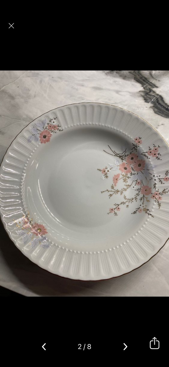 Pastel çiçek desenli, hafif kabartmalı kenarlı beyaz porselen tabak.