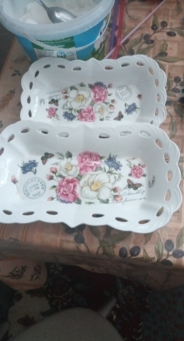 Pembe ve beyaz çiçekler ile kelebek desenli, ince delikli kenarlara sahip beyaz porselen tabaklar.