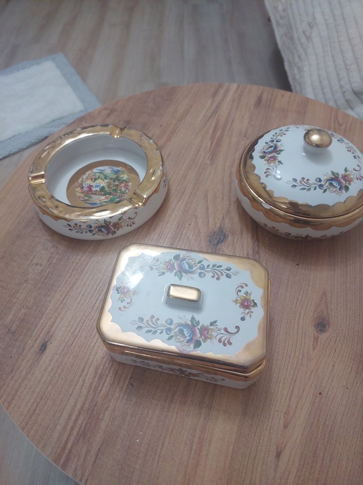 Altın detaylı, çiçek desenli beyaz porselen tabağı, kapaklı kase ve dikdörtgen kutudan oluşan vintage takım.damgalıdır.şekerliğin kenarında düşme var.kültablasında yaldızlarda soyulma var.kapaklı siğaralıkta sorun yoktur.bikerek alım yapınız.