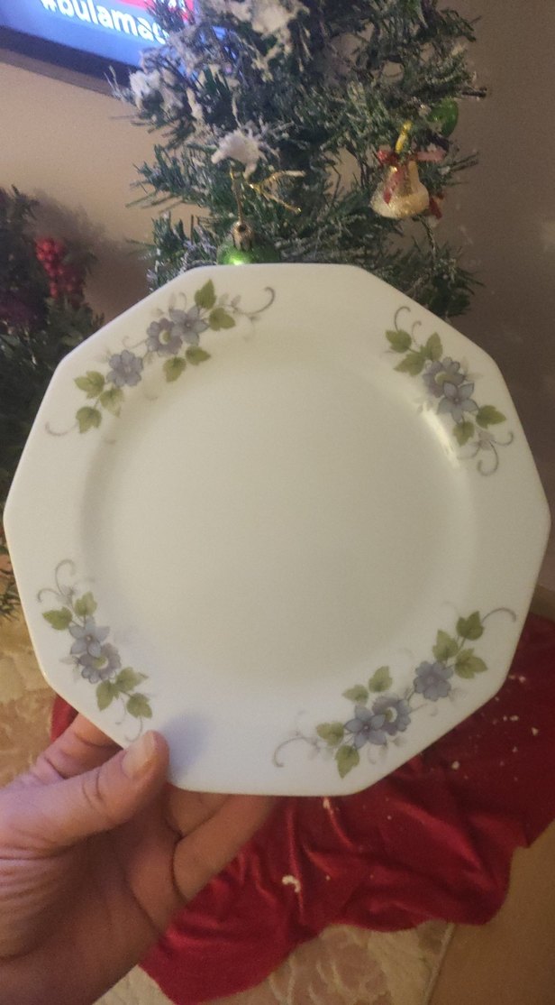 Çiçek desenli, beyaz renkli sekizgen tabak, yemek sunumu için uygun. Hafif yeşil yapraklar ve yumuşak mor çiçekler içerir. ️yurtdışından hediye gelmiştir kırığı yoktur