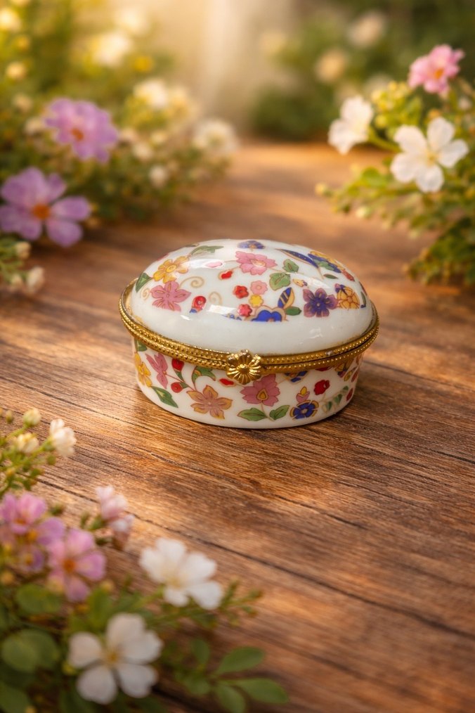 Çiçek desenli beyaz porselen kutu, altın renkli kapanma detayına sahiptir. Küçük eşyalar için uygundur.