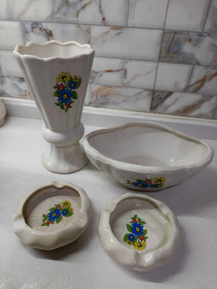 Çiçek desenli beyaz seramikten yapılmış, yüksek bir vazo ve üç uyumlu kase içeren set. Hafif renk ve zarif şekiller mekanlara şıklık katar.