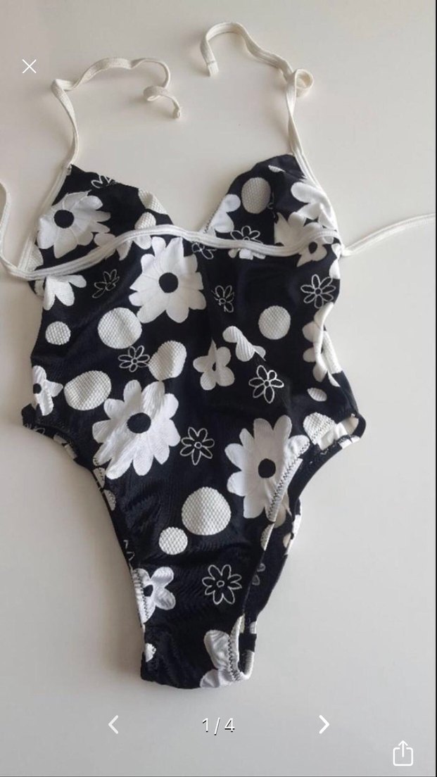 Çiçek Desenli Beyaz Siyah Mayo