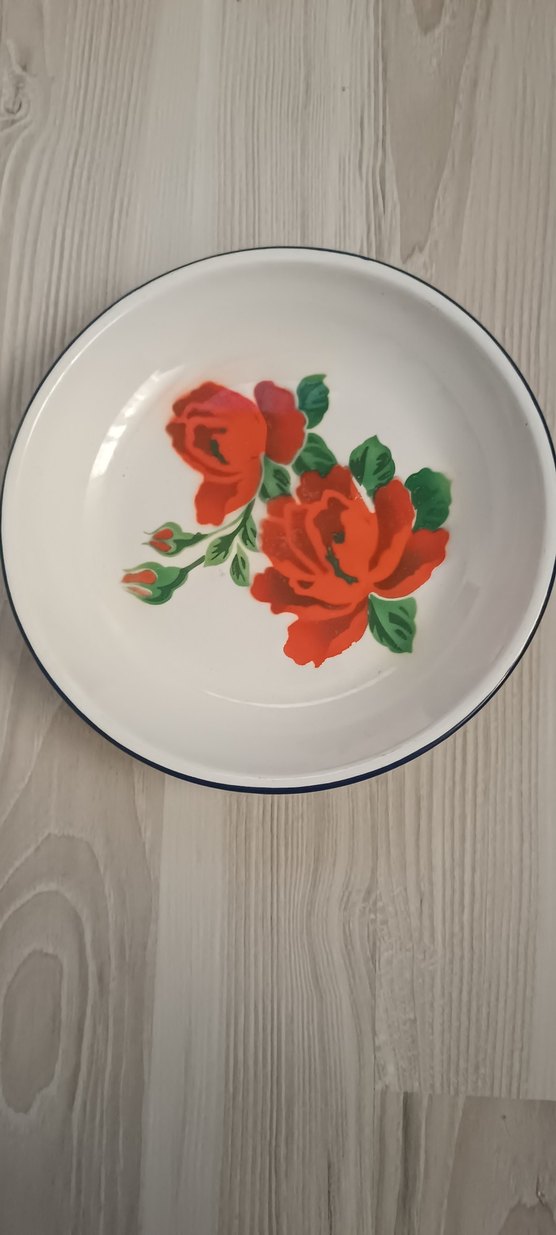 Klasik tarzda beyaz tabak, canlı kırmızı güller ve yeşil yapraklardan oluşan çiçek desenine sahiptir. Kenarında ince koyu renk şerit bulunur.