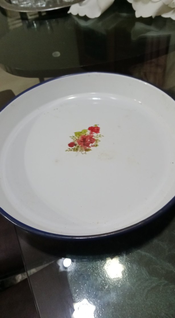 Ortasında küçük çiçek deseni ve ince koyu kenarı olan beyaz geleneksel tabak. Günlük kullanım için uygundur. ️41 cm çap
