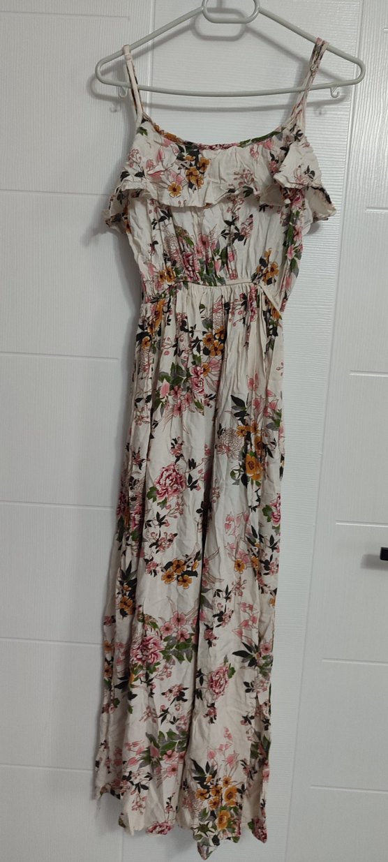 Çiçek desenli, volanlı beyaz uzun straplez elbise, bol kesim ve yumuşak sentetik kumaştan yapılmıştır.
