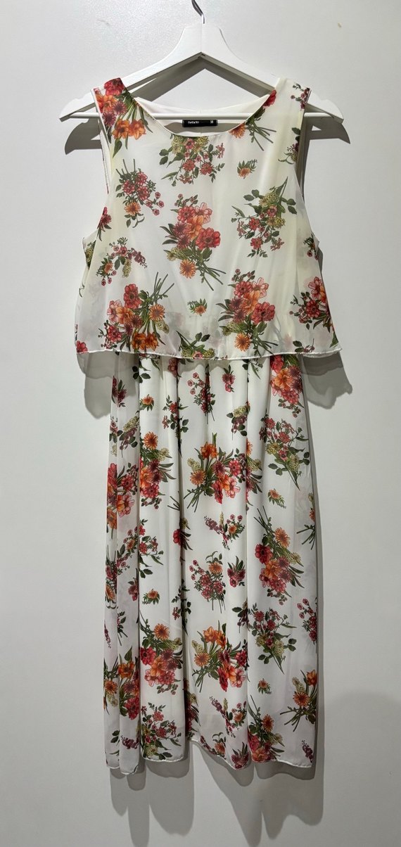 Çiçek desenli, beyaz uzun elbise, bol kesim, askısız ve kolsuz, fırfırlı detaylarla bohem tarzda.