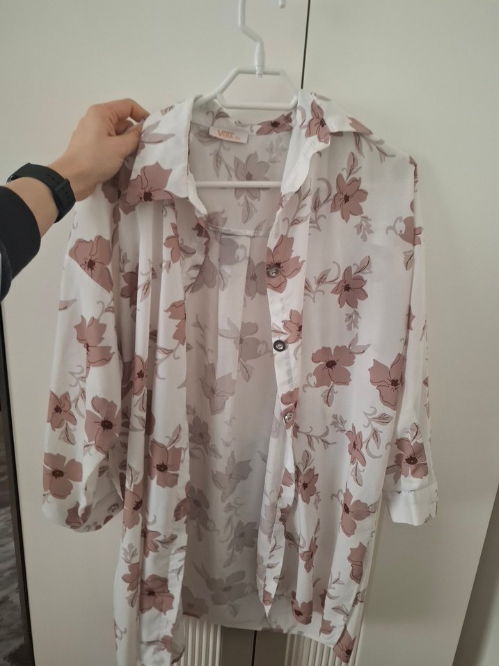 Bol kesim, uzun kollu beyaz gömlek, pastel çiçek desenli ve V yakalı, düğmeli, rahat sokak stili için. Yumuşak sentetik kumaştan yapılmıştır. Kol kısmında küçük bir sökük var sadece