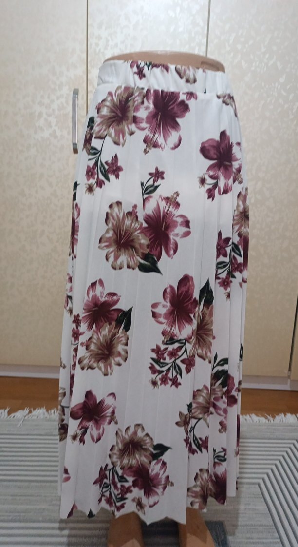 Beyaz, çiçek desenli, pilili ve bol kesim uzun etek. Sentetik kumaştan üretilmiş, bohem tarzı için uygun. SM l uyumludur beli lastik kemerlidir