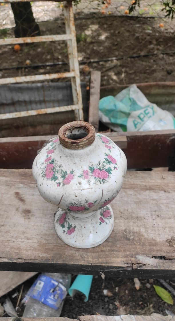 Pembe güllerle süslenmiş, yuvarlak şekilli beyaz vazo. Hafif aşınma izleri taşıyan vintage bir dekor ürünü.