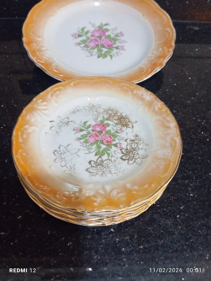 Çiçek desenli beyaz ve turuncu tabak seti, ortasında detaylı çiçek motifleri bulunur. Klasik sunumlar için uygundur. ️5 ADETDİR
