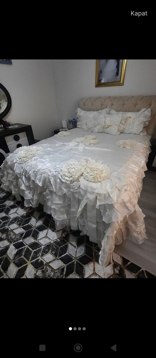 Çiçek desenli, katmanlı fırfırlı beyaz yatak örtüsü, yatak odasına yumuşak ve şık bir görünüm kazandırır.